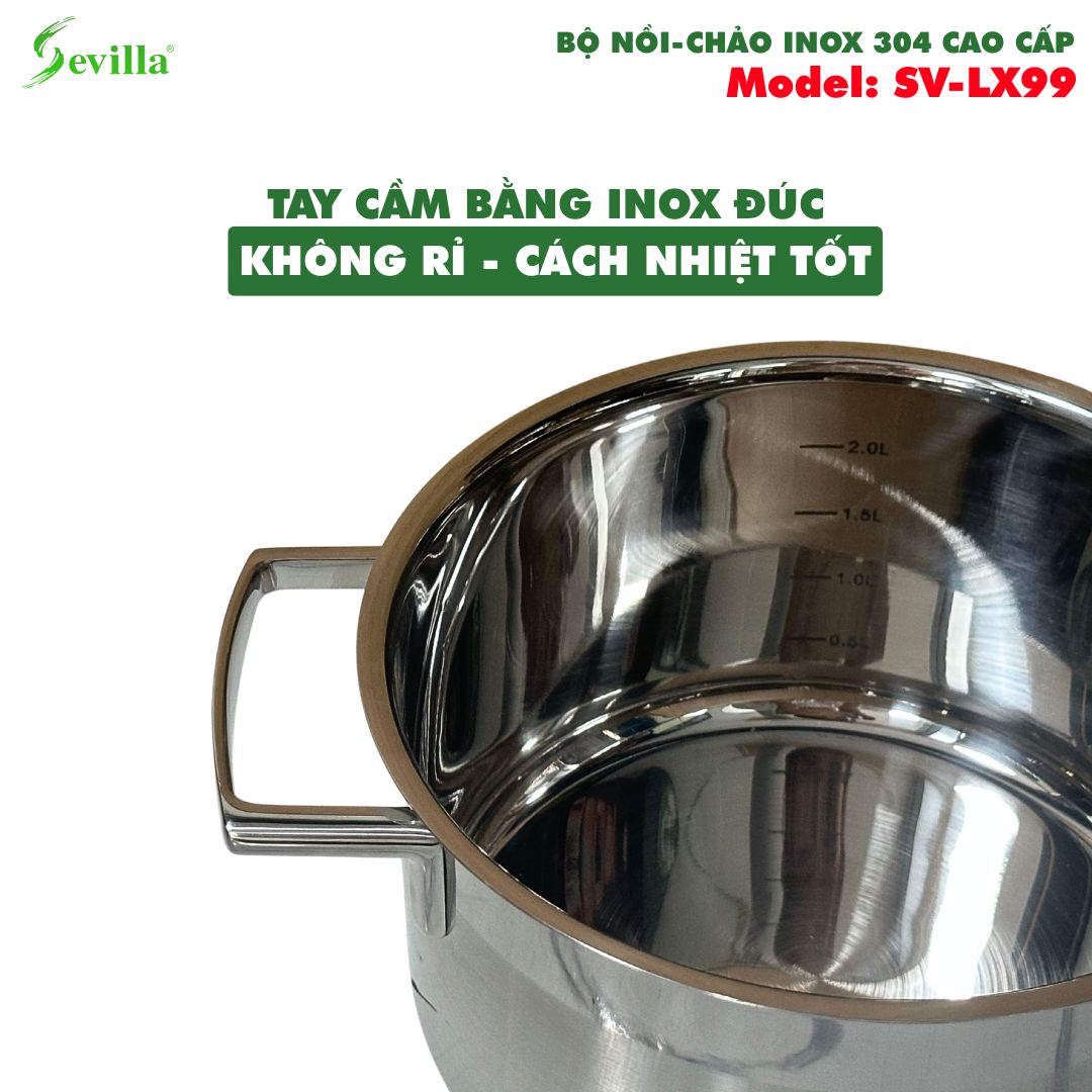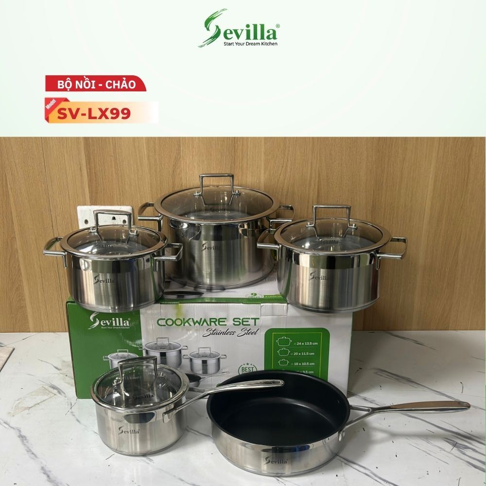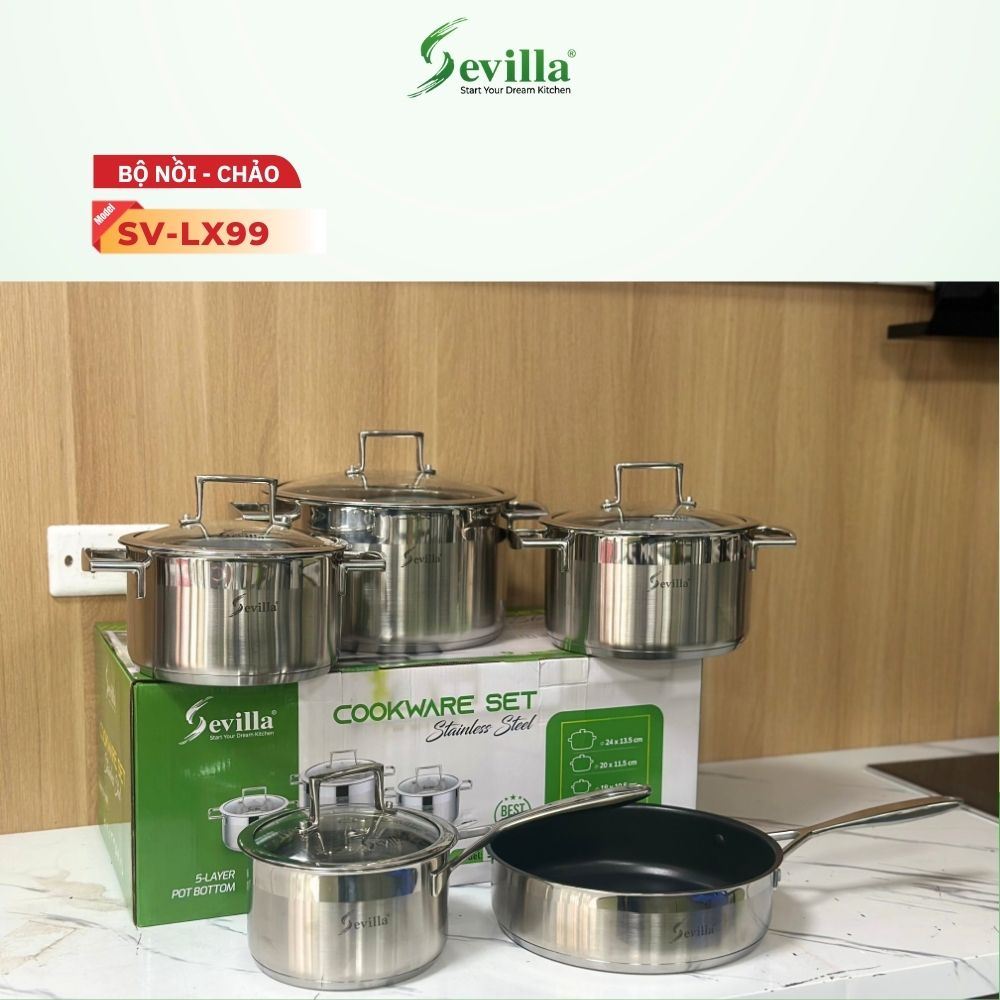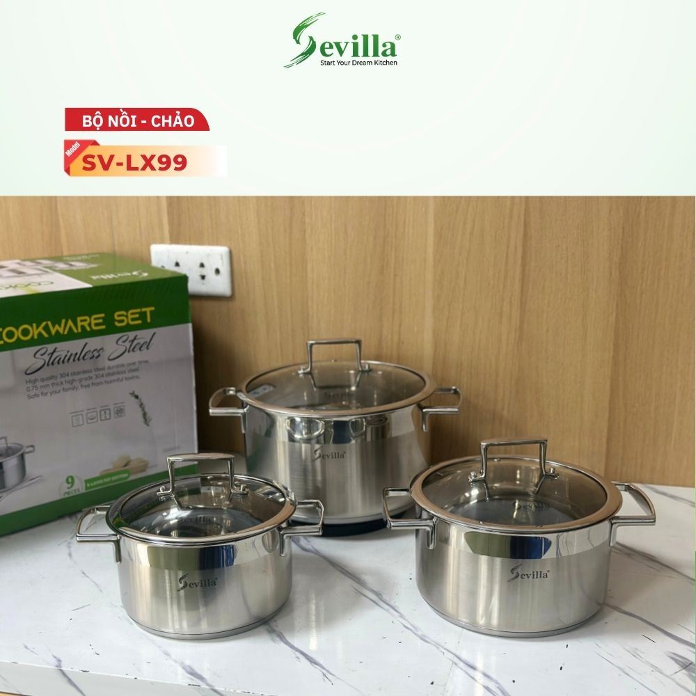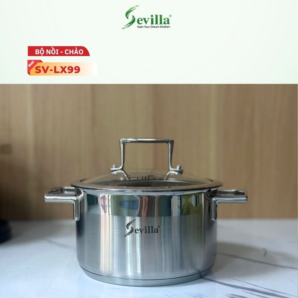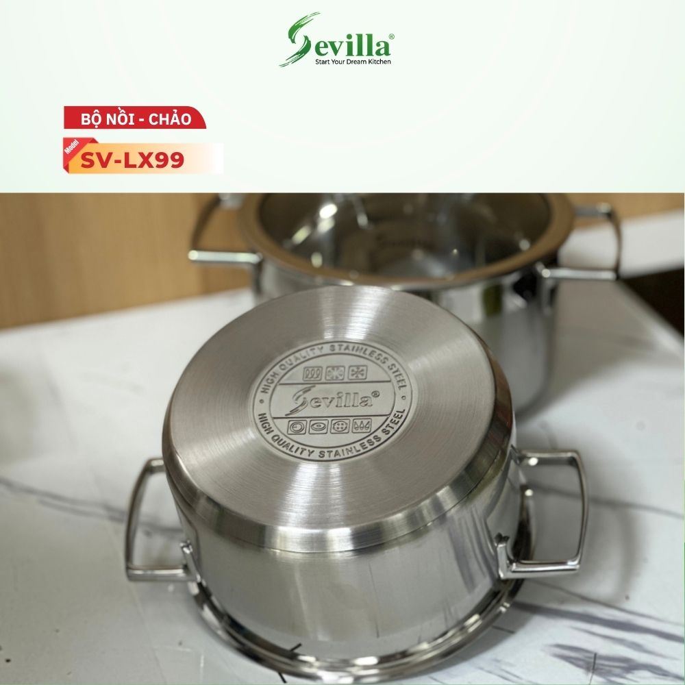 Bộ nồi Sevilla SV-LX99 còn ghi điểm với sự đa dạng về kích cỡ, từ nhỏ đến lớn, đáp ứng mọi nhu cầu chế biến trong gia đình, từ món canh, món xào đến các món hầm cần thời gian dài. Bề mặt inox sáng bóng không chỉ mang lại vẻ đẹp hiện đại mà còn dễ dàng lau chùi, vệ sinh sau mỗi lần sử dụng, tiết kiệm thời gian cho người nội trợ.