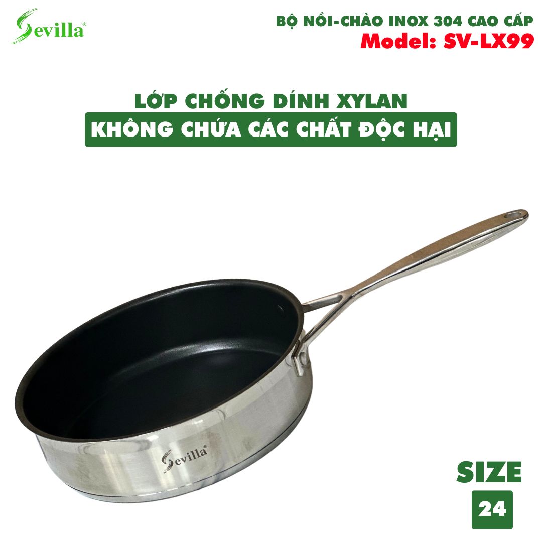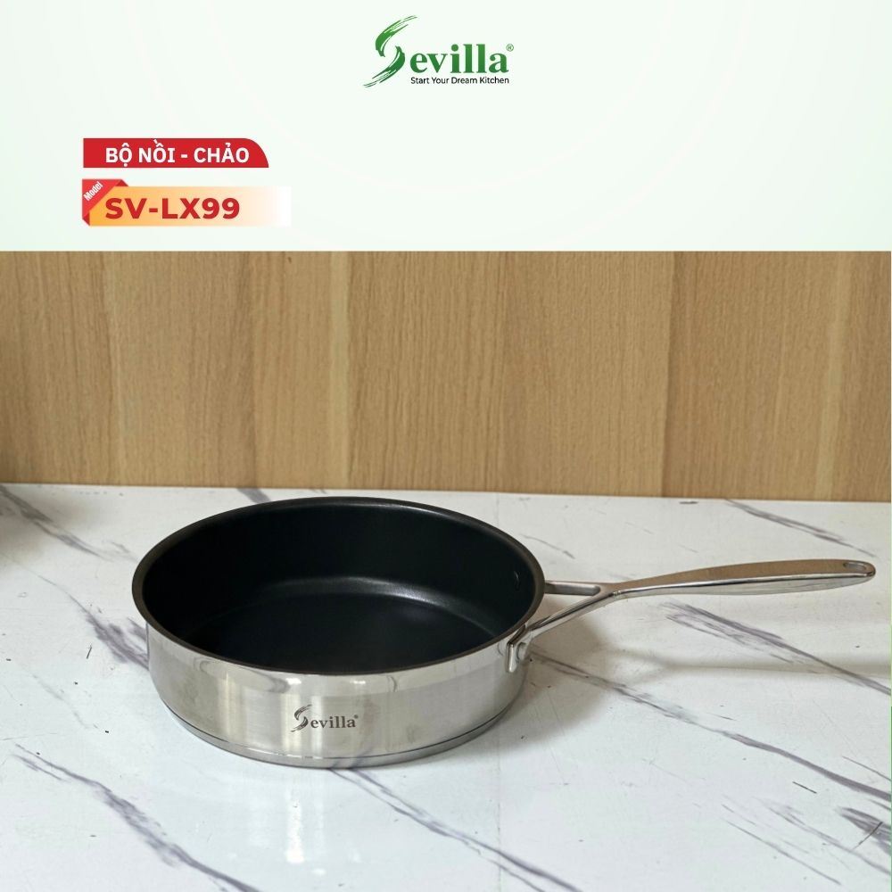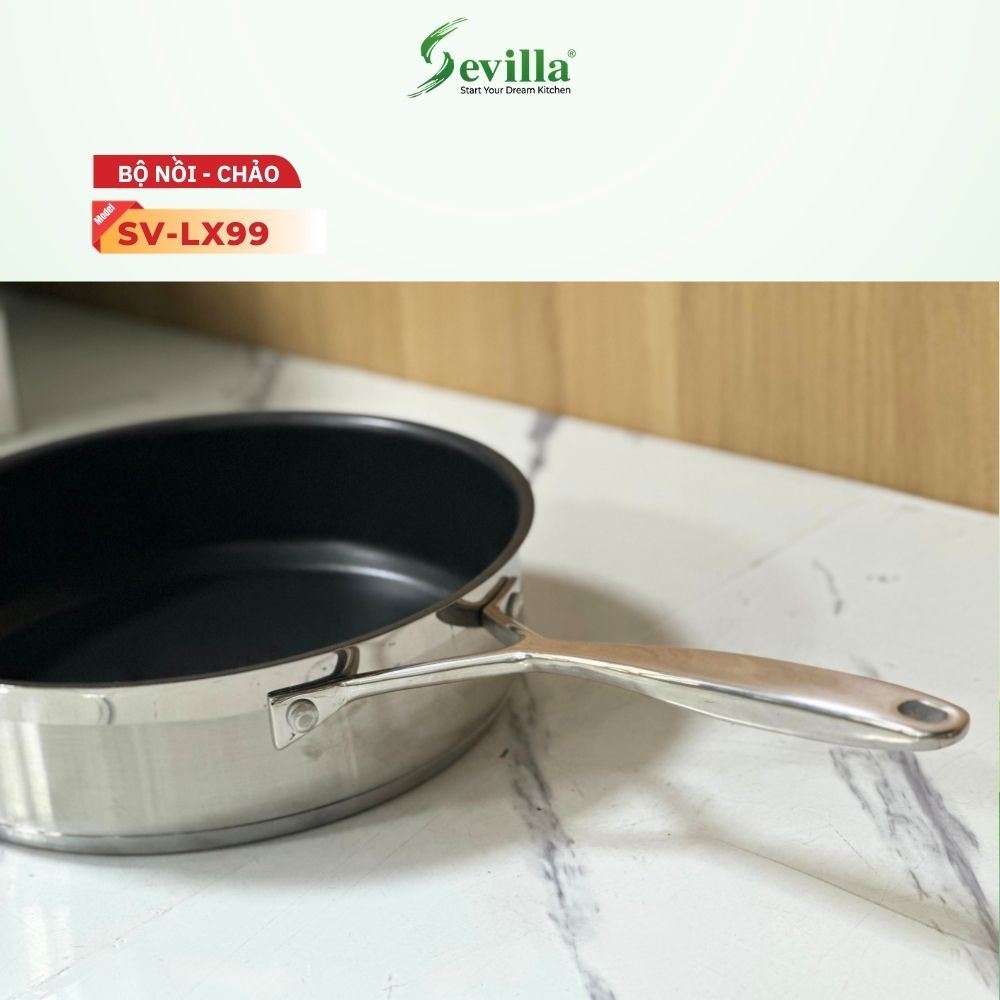 Bộ nồi-chảo Sevilla SV-LX99 được chế tác từ chất liệu inox 304 cao cấp, dày 0.75mm, nổi bật với độ bền vượt trội, khả năng chống ăn mòn và không bị oxy hóa theo thời gian. Nhờ đó, sản phẩm đảm bảo an toàn tuyệt đối cho sức khỏe người sử dụng, đồng thời giữ cho bộ nồi luôn sáng bóng như mới dù sử dụng lâu dài.