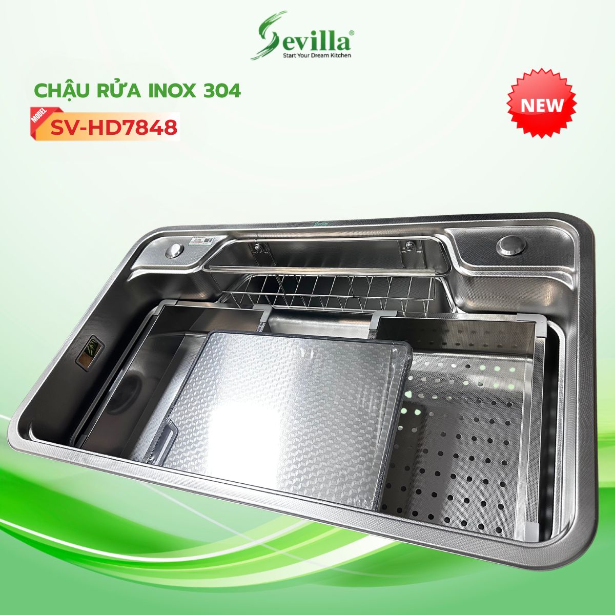 Chậu rửa bát SV-HD7848 được thiết kế theo xu hướng bếp hiện đại, kết hợp bộ phụ kiện đồng bộ đa năng, giúp tối ưu diện tích và nâng cao hiệu quả sử dụng trong quá trình nấu nướng hằng ngày. Không chỉ phục vụ nhu cầu rửa bát đĩa, sản phẩm còn hỗ trợ sơ chế thực phẩm ngay trên chậu, mang lại sự tiện lợi, gọn gàng và vệ sinh cho không gian bếp.