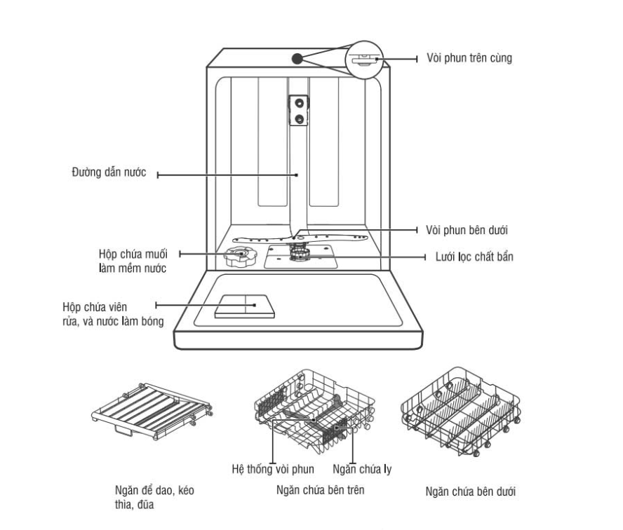 Mỗi dòng máy rửa bát khác nhau được sản xuất với nhiều kích thước và số giàn rửa khác nhau, nhưng nhìn chung cấu tạo bên trong của máy rửa bát sẽ như hình minh họa sau: